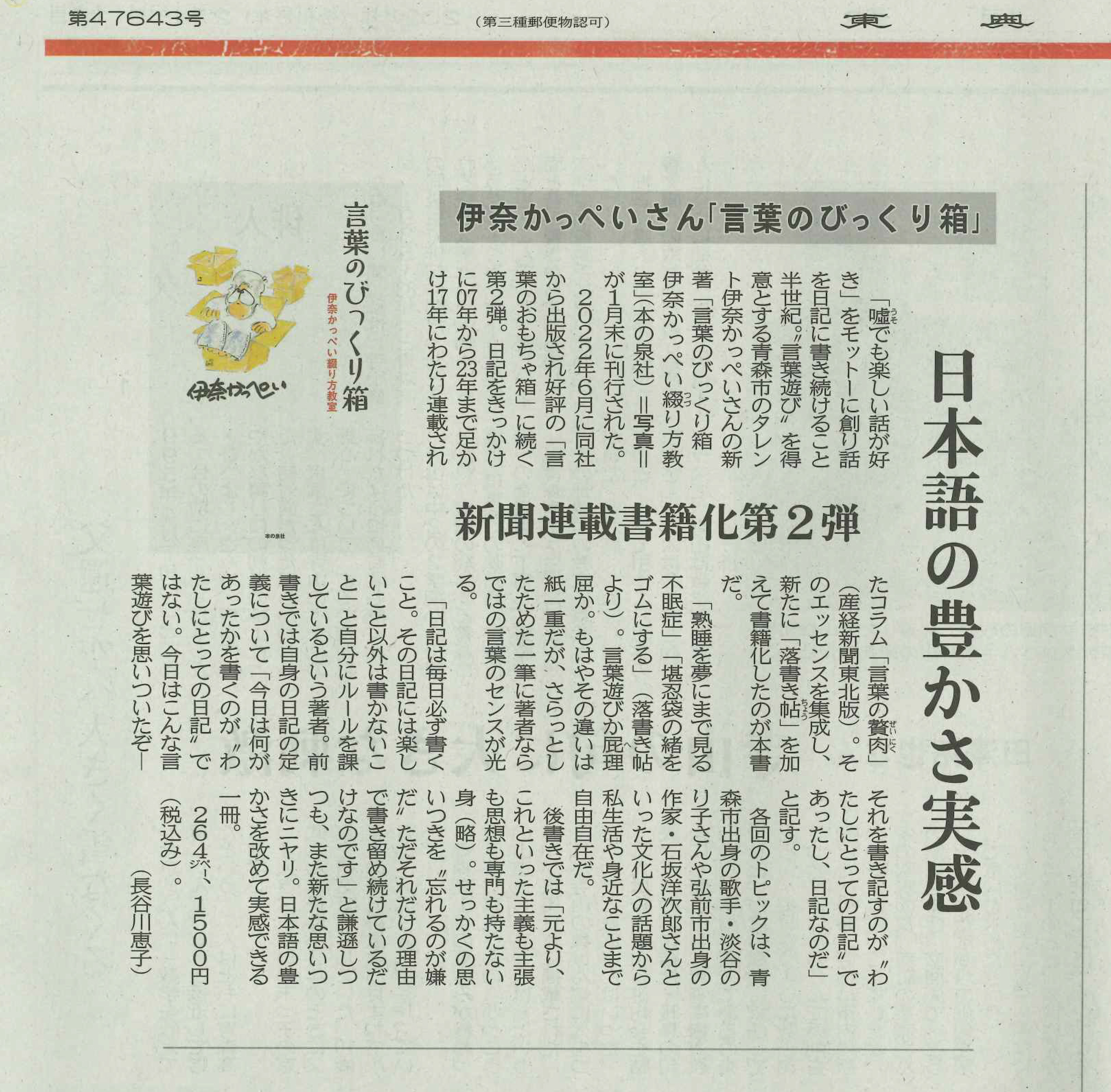 2024.2.20|伊奈かっぺい 著『言葉のびっくり箱 伊奈かっぺい綴り方教室』が東奥日報(2月15日付)で紹介されました。 >>記事