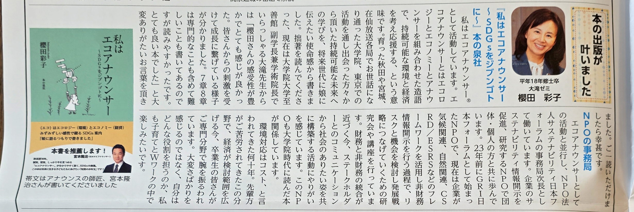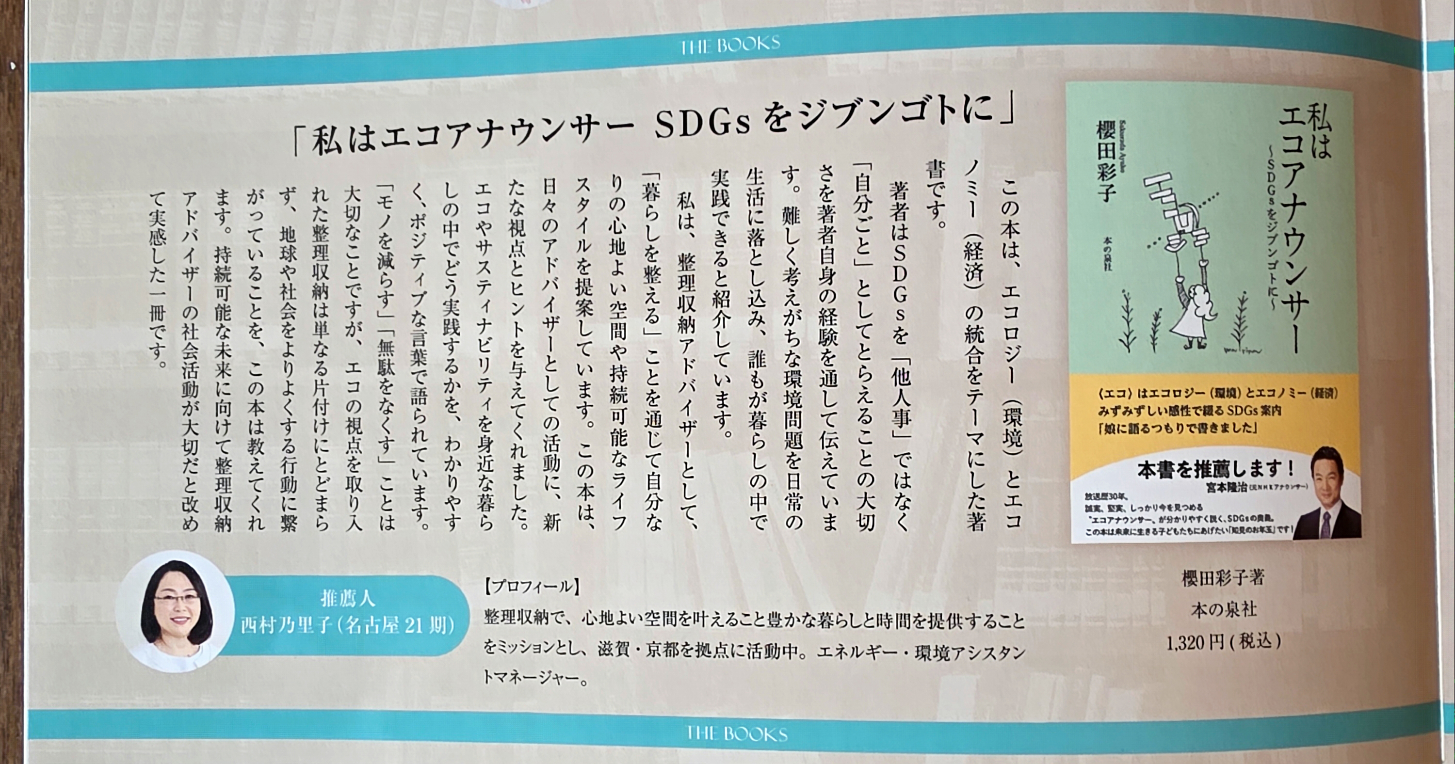 櫻田彩子先生(著『私はエコアナウンサー〜SDGsをジブンゴトに〜』)のご著書・ご活動が、以下の媒体に紹介されました。